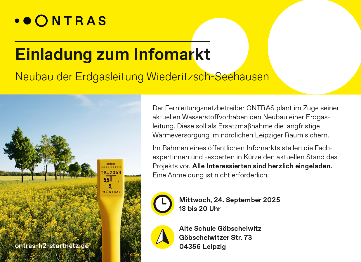 In der nördlichen Leipziger Region soll im Rahmen des ONTRAS H2-Startnetzes eine bestehende Erdgasleitung auf Wasserstoffbetrieb umgestellt werden. Um die Erdgasversorgung und damit auch die Wärmeversorgung im Leipziger Norden weiterhin sicherzustellen, ist der Neubau einer Erdgasleitung zwischen Seehausen und Wiederitzsch notwendig. Anlässlich des Abschlusses der Voruntersuchungen entlang der Vorzugstrasse, laden wir herzlich zu einer öffentlichen Infoveranstaltung in die Alte Schule Göbschelwitz ein. Dort möchten wir frühzeitig und transparent über das Projekt informieren und mit allen Interessierten ins Gespräch kommen.