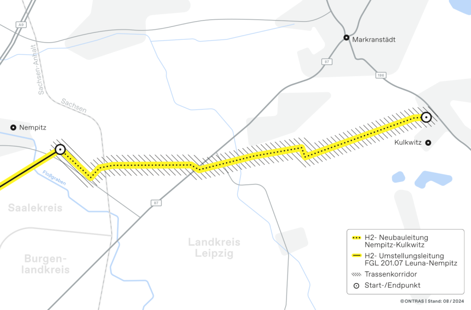 Auf rund sechs Kilometern entsteht ab 2026 zwischen Nempitz (Saalekreis) und Kulkwitz (Landkreis Leipzig) die erste H2-Neubauleitung im ONTRAS H2-Startnetz. Das Projekt ist zudem Bestandteil des IPCEI Green Octopus Mitteldeutschland (GO!), der künftigen Transportroute für Wasserstoff für das mitteldeutsche Chemiedreieck sowie die Industriezentren in Sachsen-Anhalt und Niedersachsen.